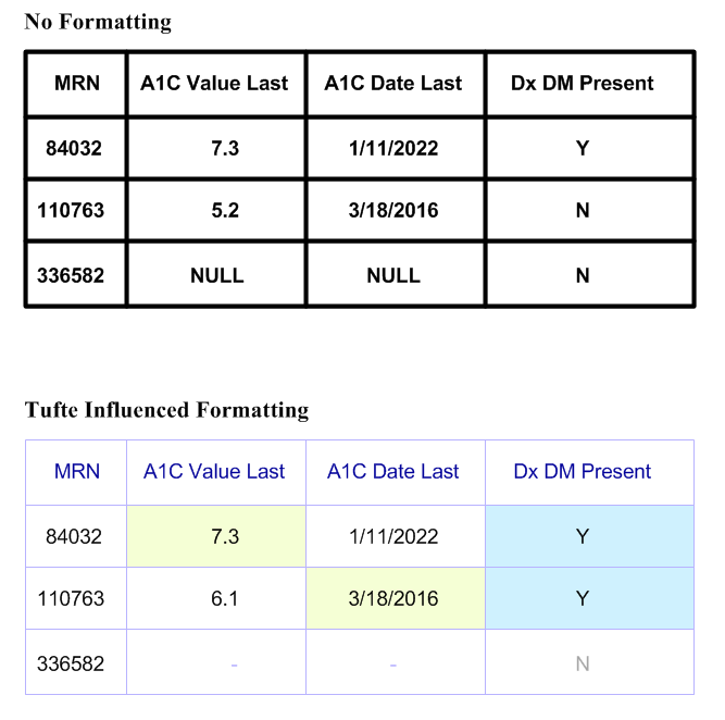 Despite all of the complex ways data can be evaluated, the most important quality checks are the ones which ensure that data sources had current data and that processing completed as expected for each harvest. Complex statistics for data quality should wait until after basic harvest checks are in place. Study the Work of Edward Tufte: Edward Tufte emphasizes reducing visual clutter while allowing details to be viewed and explored. Tufte's book The Visual Display of Quantative Information is a good start. Website: www.edwardtufte.com/tufte/ ![]() The unformatted report, which often crops up, is like a piece of concrete. The second, following some of the guidelines and ideas of Tufte, is easy to skim. If you are a worker who actually reads thousands of lines of reports per week, you will appreciate reports which follow Tufte's guidelines. Of course there is only so much time in the work week. A general set of rules will be easier to implement than one specific to the report. Flagging a high A1C value, for example, will require custom programming or rule setting for the report column. It is often not practical to do this. Note that flagging a value as out-of-range should be done with the formal approval of a medical professional. A report which "interprets" values in ways not approved by a medical professional can be a violation of basic healthcare laws. For reports visible to large audiences, you may want to provide the option of an unformatted report. Though many team members will expect or even demand helpful formatting, some will insist on a basic view. Expect occasional friction between "the enlightened" and the narrowly educated. At least report discussions will be less damaging to a project than UI discussions. Software libraries meant to help people churn out reports may make custom formatting quite difficult. Your life may be better without such custom libraries. Processing Reports: Reports generated by the steps for harvesting and processing data are quite helpful. Content can include: